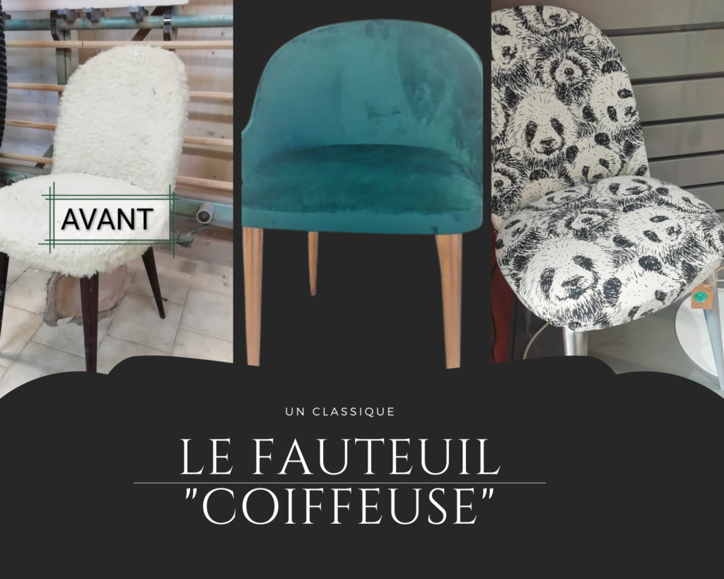 On l’appelle Fauteuil » coiffeuse » car c’est souvent un fauteuil que l’on retrouve face aux meubles Coiffeuse. Typique des années 60/70, il est souvent recouvert d’une moumoute, tissu poilu très à la mode à cette l’époque.