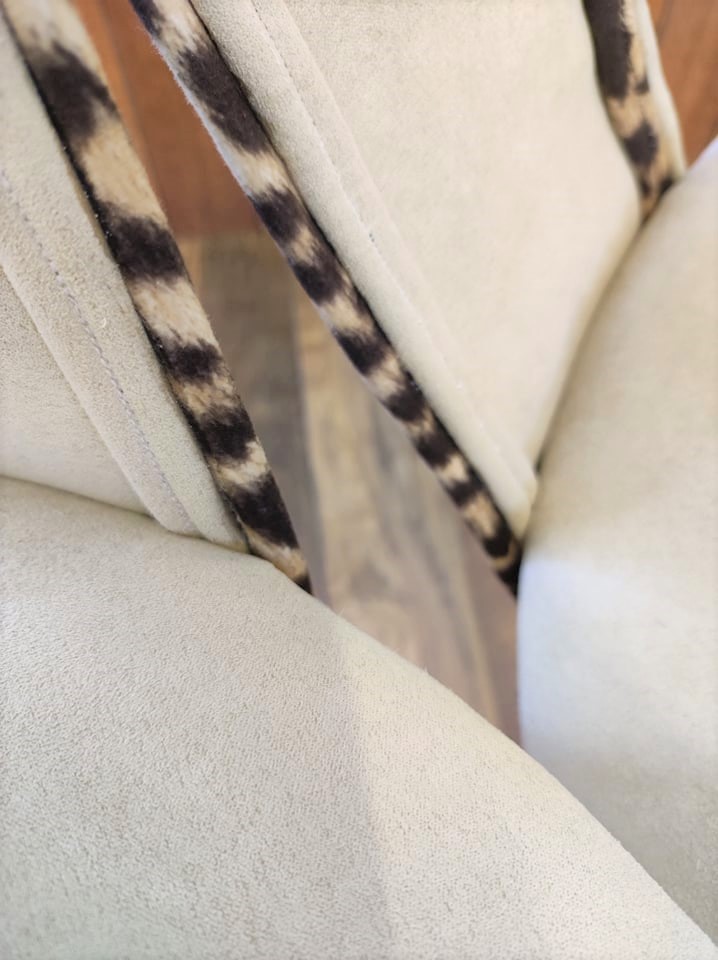 Tissu suédine beige, petit rappel de léopard avec un double passepoil en velours et gros clous tapissiers pour finir le haut des pieds.