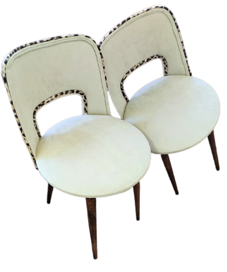 J’ai choisi un tissu suédine beige et deux galons de finition. L’un identique au tissu posé et l’autre en tissu léopard. Le tout s’associe parfaitement aux couleurs du bois.