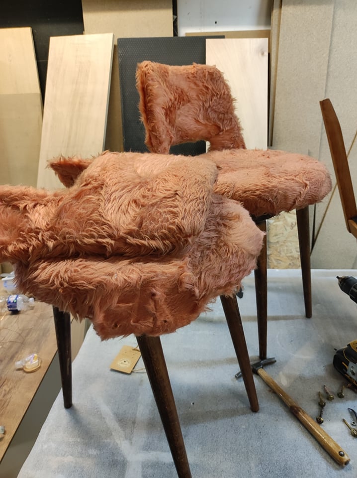 Le tissu était, quant à lui, une moumoute rose des années 50, poussiéreuse et déchirée.