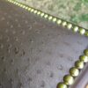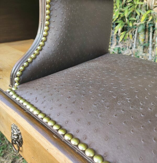 Entièrement refait à neuf en similicuir marron imitation autruche et des clous tapissiers dorés.