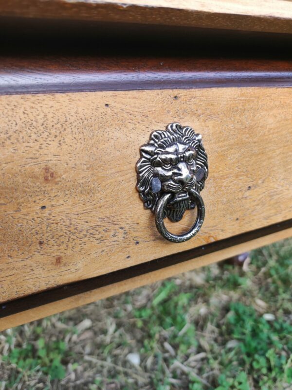 Il est ciré sur les chants plats et vernis dans les moulures.